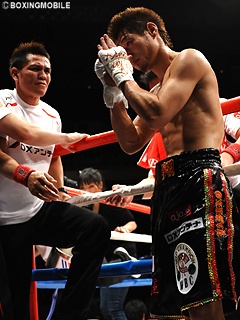 スピードと回転力の長谷川、パワーのモンティエルとが積極的にパンチを繰り出すが、両者は巧にディフェンス。クリーンヒットを許さない一進一退の攻防となるも4Rラスト10秒、モンティエルの左フックが長谷川にクリーンヒット。すかさず長谷川をロープに詰め、モンティエルがラッシュ。ここでパンチを浴び続ける長谷川を見兼ねたレフェリーが、終了直前にストップをかけ、この瞬間モンティエル陣営は歓喜に包まれた。
