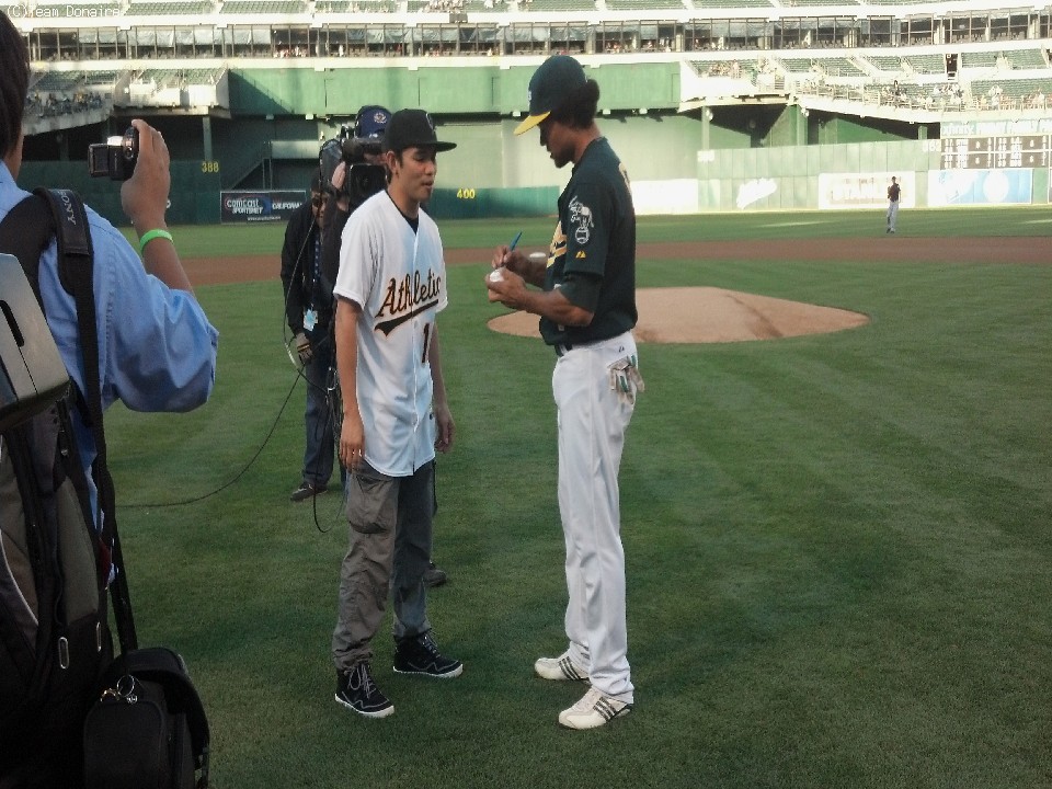 10月13日(日本時間14日)にWBC名誉王者の西岡利晃(帝拳)とスーパーバンタム級の頂上決戦を控えたWBO&IBF王者ノニト・ドネア(比/米)が17日(日本時間18日)、野球選手の松井秀樹が昨年在籍したメジャーリーグ球団オークランド・アスレチックスで始球式を行った。
