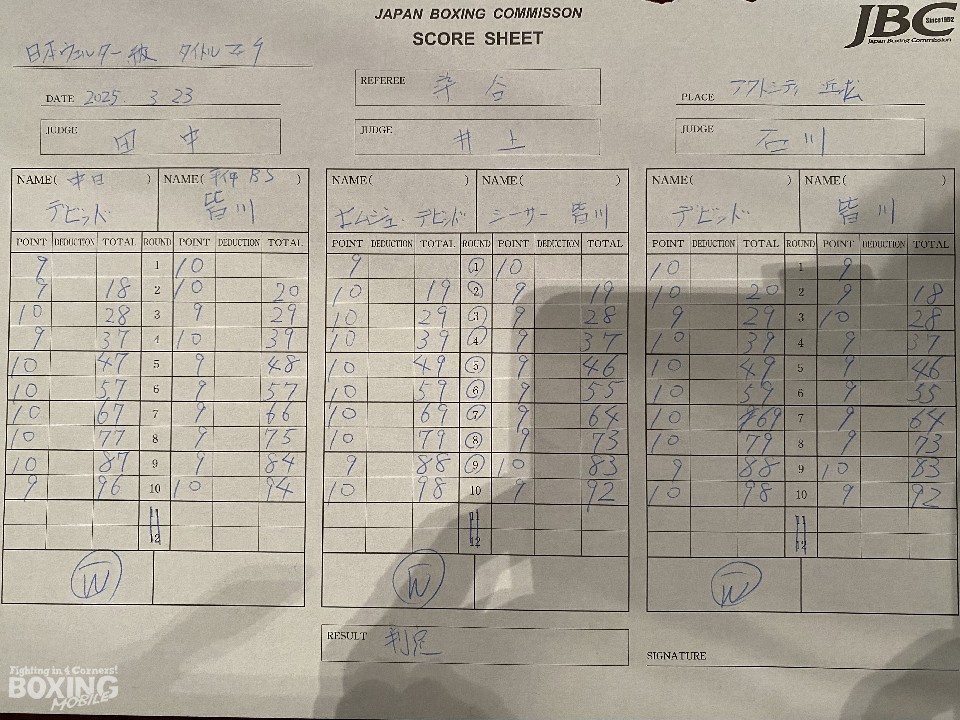 サウスポー皆川がリングを大きく使いながら左ストレートを狙うのに対し、セムジュはプレスをかけて右ストレートで対抗。相手の攻め手を切り、単発の左を当てる皆川と強引に前に出たセムジュの構図に、ジャッジも頭を悩ませた。前半終了時の公開採点は48-47×1皆川、49-49×2でセムジュがリード。これに気をよくしたセムジュは、さらに圧力を強めて、右ボディストレート、左フックをヒット。皆川は9回に左フックをねじ込み挽回したが、セムジュは積極性をアピールした。