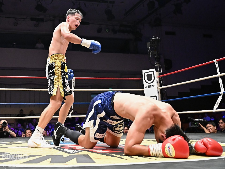 岡本がステップを刻みながら、ノーモーションの右ストレートをボディ、顔面に打ち分けてペースを掌握。サウスポー廣瀬は、プレスをかけて左ボディで動きを止めにいくが、岡本は足を使いながらメリハリのある攻撃を見せた。勝負が決まったのは7回。岡本は右アッパーで廣瀬をグラつかせると、パンチをまとめてダウンを演出。レフェリーは試合をストップした。