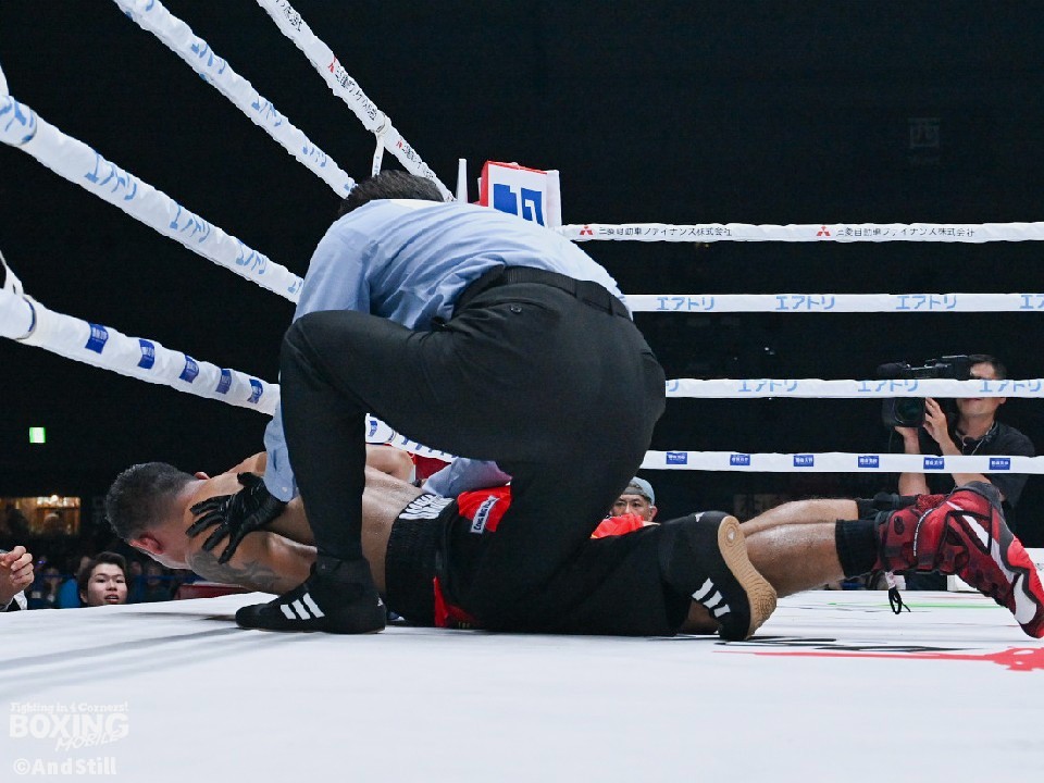 サウスポーのダスマリナスが積極的に前で勝負を仕掛けたのに対して、岡本は右ボディストレートでスペースを作った。試合が決まったのは5回、一進一退の攻防戦から、岡本の右ストレートがカウンターで入って勝負あり。前のめりに倒れたダスマリナスを見て、レフェリーが試合を止めた。5ラウンド1分18秒TKO決着。