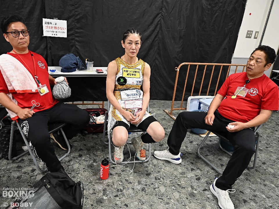 堺春木ジムの春木博志会長(写真右)は、「本来、奥田はアウトボクサーだが、いつも以上に攻める作戦を取った。それで気負わせてしまった。セコンドの責任で、本人はよくやった」と悔やんだ。