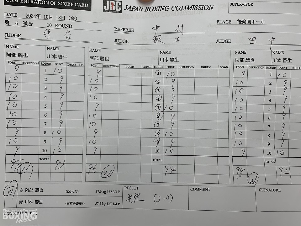 初回、川本がシャープなジャブで先制攻撃。しかし、サウスポー阿部は2回からノーモーションの左で顔を弾くと、上下に打ち分けポイントを連取。中盤、ボディにパンチに集めて左ストレートで、川本から鼻血を流させた。要所要所で攻勢をアピールするパンチを当てた阿部だが、川本は気持ちを切らさず、食い下がった。最終10回、川本は右オーバーハンドで効かせると、連打で攻勢。阿部は、クリンチで後続打を避けた。試合運びの上手さを見せた阿部が勝利した。