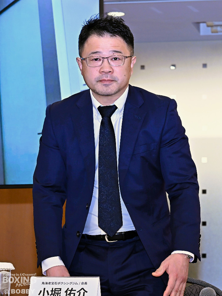 会見に同席した元WBA世界ライト級王者で角海老宝石ジムの小堀佑介会長は、「奥村健太トレーナーとともに分析している。非常に強いチャンピオンだが、角海老魂で勝ってほしい」とエールを送った。