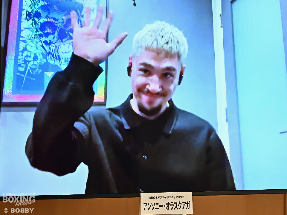 米国ロサンゼルスからオンラインで会見に臨んだオラスクアガは、「前回の試合から短いスパンで日本で戦えることに感謝している」と語り、挑戦者については「軸足をしっかりと使い、カウンターが上手い選手」と分析。その上で、「より賢く戦ってKOする。日本には友人を作りに行くのではない。勝つために行く」と、チャンピオンらしい言葉で締めた。