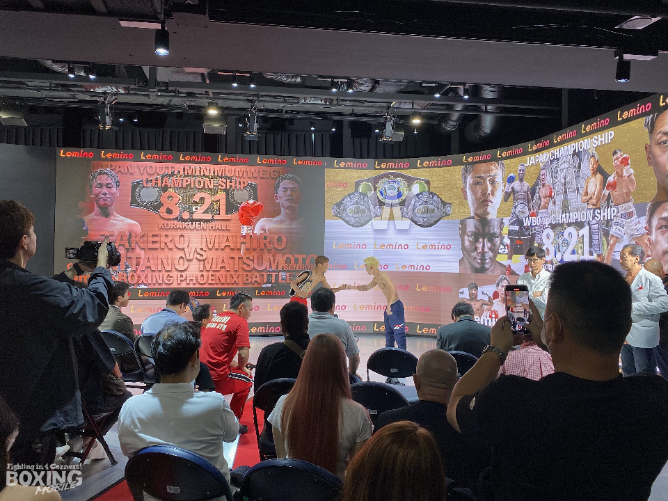 日本ユース・ミニマム級タイトルマッチの前日計量が20日、東京ドーム内bule-ing!で行われ、王者の北野武郎(21=大橋)と挑戦者の松本磨宙(23=泉北)が健闘を誓い合った
