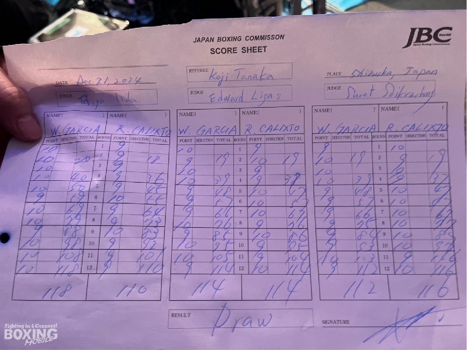 序盤から前に出て豊富な手数で攻め立てるガルシアに対し、カリストはジャブから組み立てた。中盤、手数が落ちないガルシアにボディで対抗したカリストだが、相手の勢いを止めることができず。後半になっても手数を落とさないガルシアに、カリストはカウンターで応戦した。ジャッジに委ねられた採点は三者三様の引き分けで、新チャンピンは持ち越された。