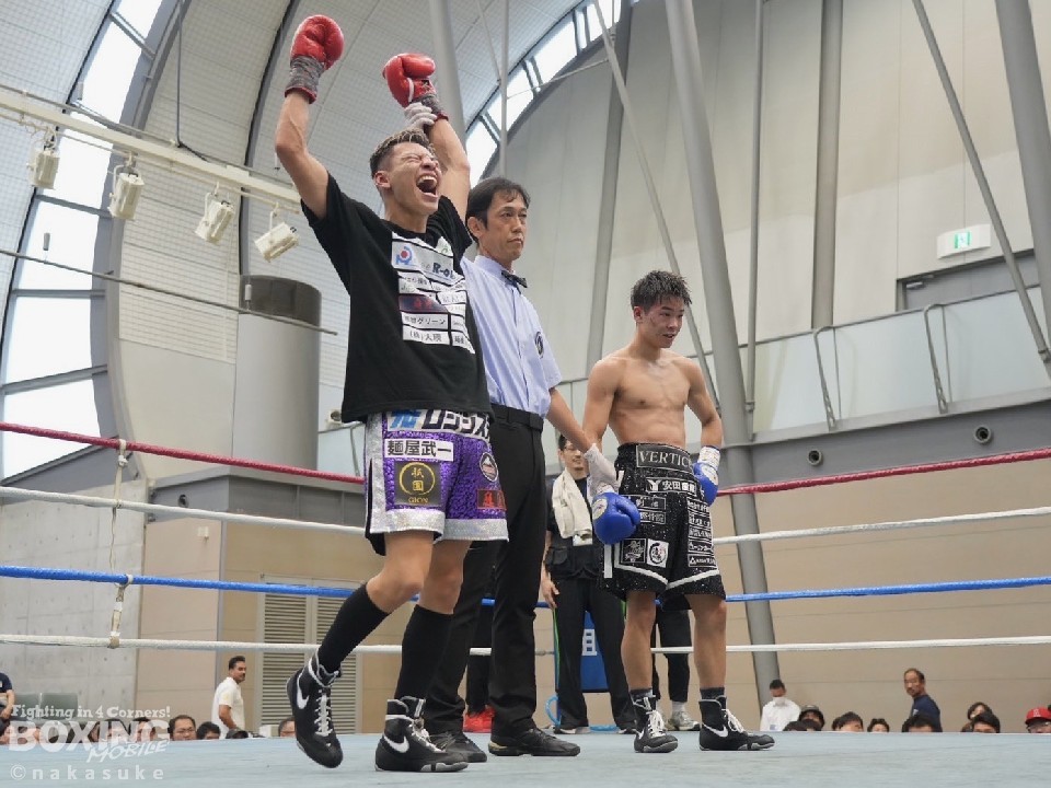 対戦した岡については「距離感がうまくて、中間距離だとパンチをもらってしまった。かなりスキルのある選手だなと感じた。お互いアマチュア出身なので、お見合いの時間を減らして、自分から行くと対応できないかなと考えた」と印象を口にした。今後は「まだ日本10位ですが、日本チャンピオンになれる立ち位置にいるので、日本チャンピオン目指していきたいと思います」と、日本ユースタイトルで得た日本ランキング10位確約のチャンスを活かして、国内トップ戦線に食い込んでいく。