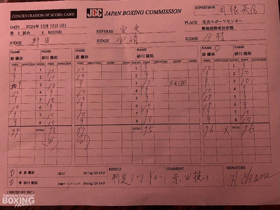 一方、砂川は、「勝てた試合だっただけにショック」と悔しさを露わにした。「序盤から動きが硬かった。終盤は感覚を掴んだが、スパートをかけるのが遅かった。原との距離が思ったより遠くてやりづらかった」と振り返ると、「また一から、日本タイトル戦線に絡めるようにやり直します」と力強く再起を誓った。