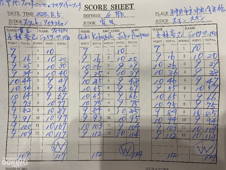 初回、アンパロが右クロスでダウンを奪うと、再び右で倒して絶好のスタートを切った。2回以降も小林は打ち終わりを狙われ、苦しい展開。5回、小林は左ボディを突き刺し反撃に転じると、徹底したボディ攻撃で挽回した。9回、アンパロはキレのある右ストレートで顔を弾くと、リターンの左フックで再び突き放した。