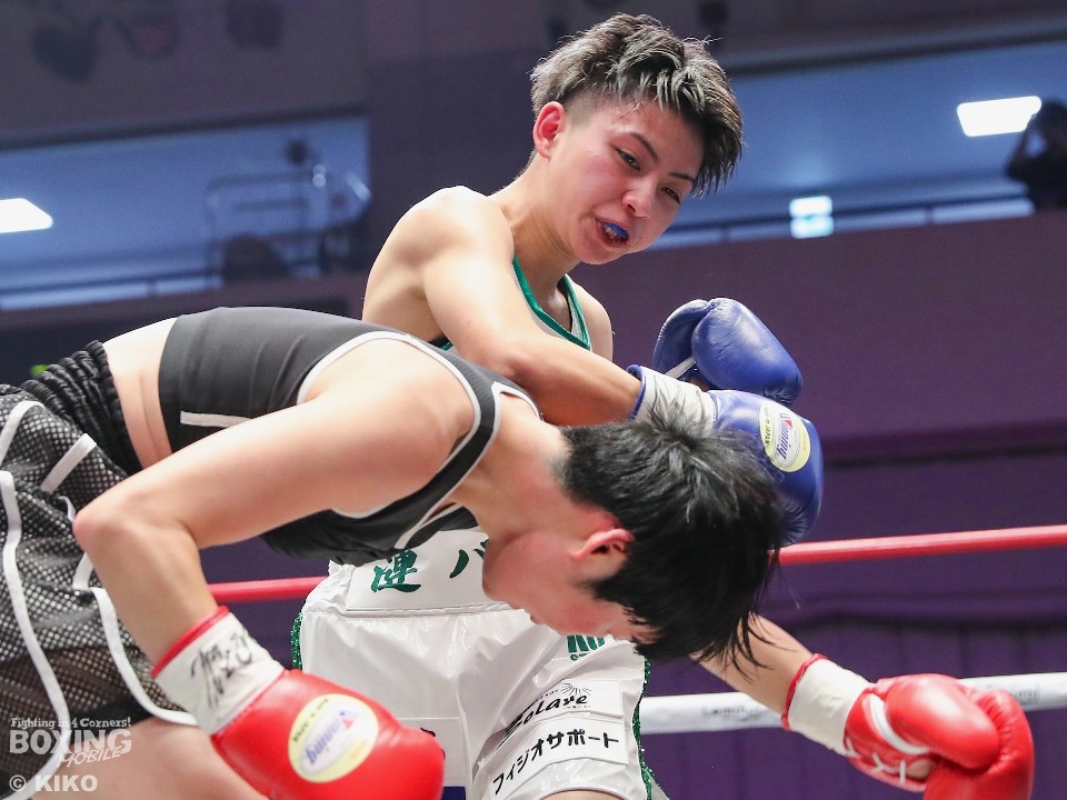 1〜2回は、漣が右フックをねじ込み、ジャッジに攻勢をアピール。しかし、前原もプッシュしながら、ボディにパンチを集めて反撃。終盤もお互いに手数を落さず打ち合ったが、漣の有効打が上回った。