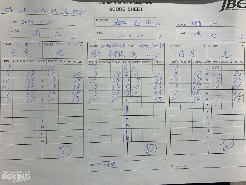 一方、惜敗した前原は「やり切った。見栄えの悪さが課題で、パンチをもらった時の見え方が良くなかった。相手は、すごくパンチも気持ちも強かった。私は気持ちが折れやすいが、打ち負けている場面でも気持ちを強く前に出て、自分に負けなかった。そんな自分を見離さず、このタイトルマッチまで一緒に来てくれた加藤さん(加藤健太トレーナー)や、職場の皆、家族、自分に関わる全ての人に感謝している。まずはゆっくり休んで、今後のことは加藤さんと決めていきたい」と前向きに語った。