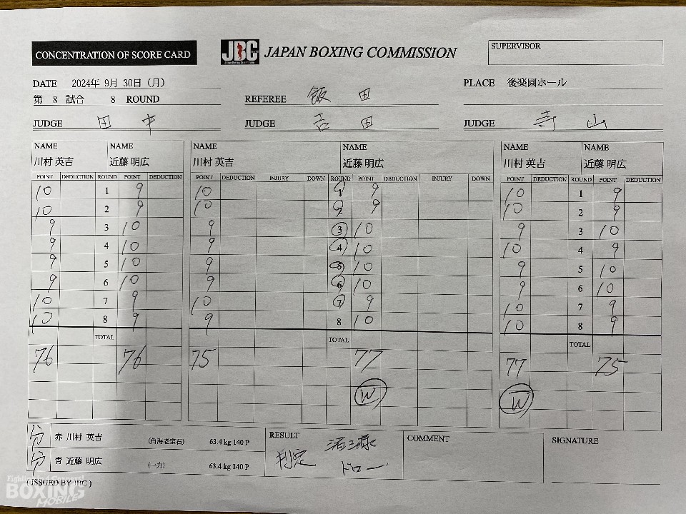 序盤は川村が左ボディ、左フックを決めて見栄えの良さをアピール。3回、近藤は足を使いながら、ジャブから右クロスを好打。4〜6回は押し合いが続く中、試合巧者ぶりを発揮した近藤がポイントを連取した。後半、川村は右フックをねじ込み挽回した。ジャッジに委ねられた採点は、三者三様の引き分けだった。