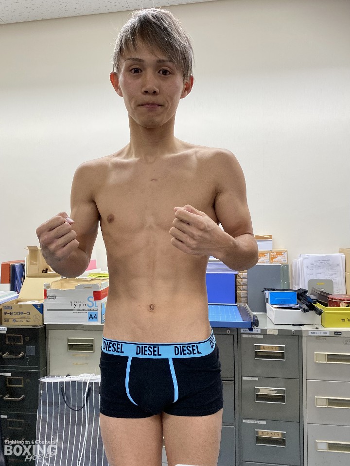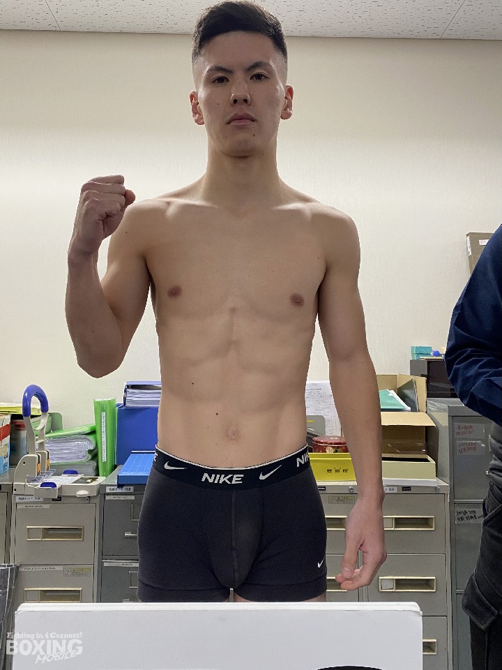 宮下は、西日本新人王技能賞を獲得し、西軍代表決定戦でも初回KO勝ちしたサウスポーのテクニシャンだ。300gアンダーの53.2kgで秤を降りた宮下は、「東京での試合で、(移動による)コンディションが心配だったが、しっかりと仕上がった」と納得の表情を浮かべた。