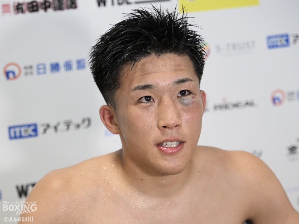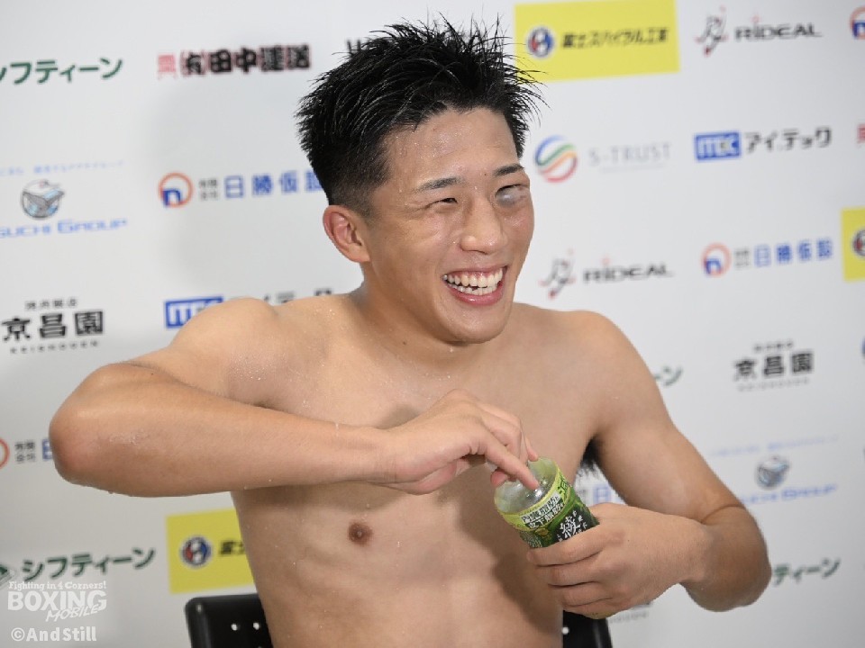 「今日のプランは、最初はジャブを突いて遠い距離でポイントを取るというのが僕の形なので、それをやっていこうと思ったが、2Rに相手が左ボディストレートを打ってきて、タイミングがすごく良くてパンチもあるなと感じ、これは近い距離の方が安全かなと思った」と試合を振り返った。その上で、「相手にもこちらのボディが入って、何度かウッという声を出していた。このカウンターのボディは、高橋トレーナーと練習していたもので、ピンチの時こそチャンスだから、それを打っていけとずっと言ってくれていて、それが出せたかなと思った」と笑顔を見せた。