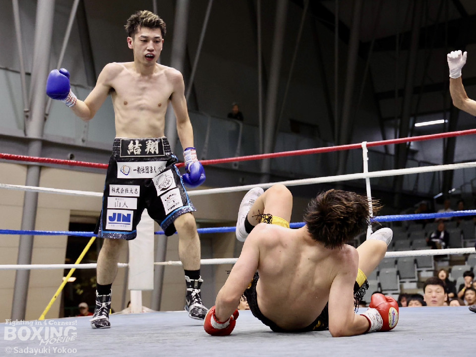初回から加藤が鋭いワンツーを先制し、中里も右ストレートで応戦。中盤は、加藤のアッパーと中里の右が交錯する一進一退の攻防に。迎えた最終4回、中里の右ストレートがクリーンヒットし、ダウンを奪うと、立ち上がった加藤にラッシュを浴びせ、レフェリーストップ。37歳を目前に、中里がうれしい初のTKO勝利を飾った。