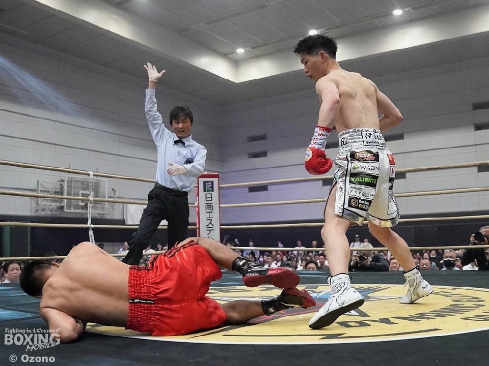 一気呵成に踏み込んだ伊藤が右ストレートを振り抜き先制。ヨーティンの反撃をスウェーバックでかわすと、右ボディを返しで打ち込み、痛烈なダウンを奪った。なんとか立ち上がったヨーティンだが、伊藤はもう一度右ボディをめり込ませて、レフェリーストップを呼び寄せた。期待の新星が、わずか55秒で初勝利を手にした。