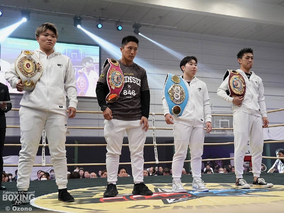 セミファイナルの前には、タイトルを獲得した真正ジムの4選手、柳井妃奈実(日本女子バンタム級王者)、ぬきてるみ(WBO-AP女子バンタム級王者)、山中菫(IBF世界アトム級王者)、大橋哲朗(WBO-APスーパーフライ級王者)に対し、西日本ボクシング協会から金一封が贈呈された。