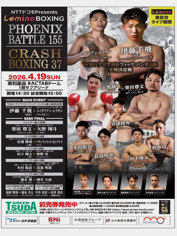 大橋ジムは24日、「Lemino BOXING PHOENIX BATTLE 155」「CRASH BOXING vol.37」の対戦カードを発表した。試合は4月19日(日)、大阪・東和薬品ラクタブドーム サブアリーナで開催される。