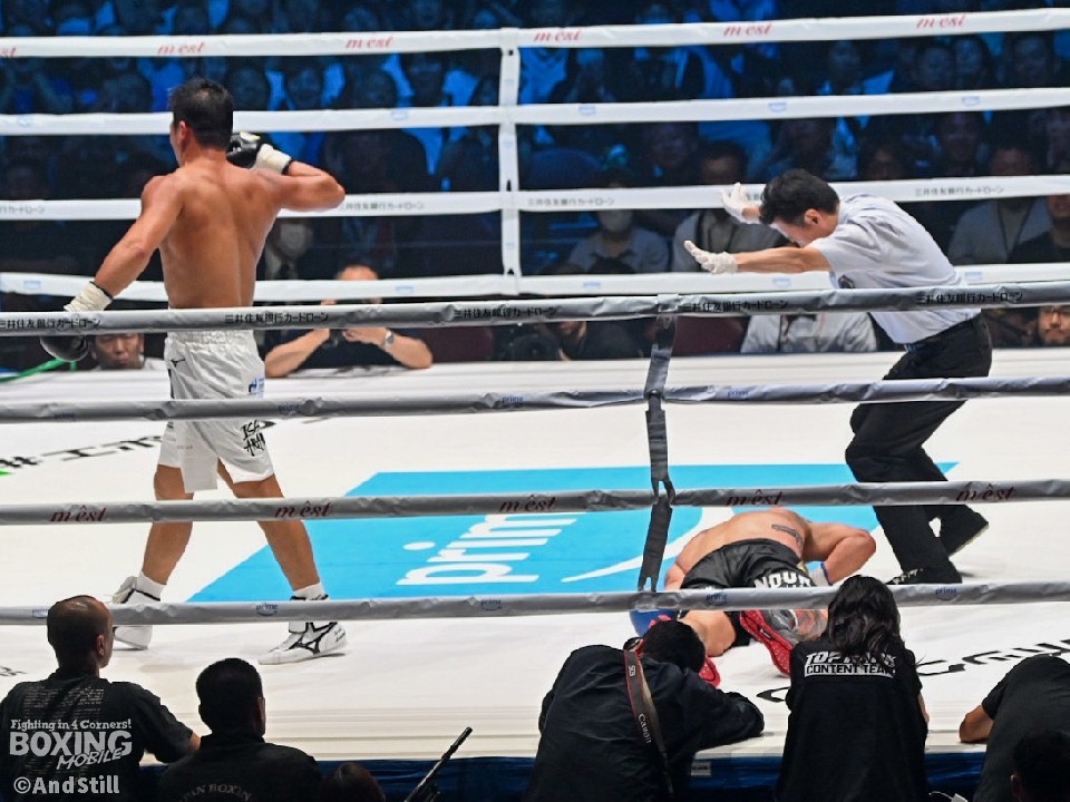 序盤からジャブと左ボディでプレッシャーをかけた荒本だが、モンゴンスーはガードで凌いで、距離が詰まると、細かいパンチの交換に応じた。4回に左フック、右フックと続けて顔面を弾いた荒本だったが、モンゴンスーはクリンチで逃れた。中盤、ロープローでモンゴンスーに回復の時間が与えられたが、荒本のプレッシャーは続いた。最終回、中間距離から左フックを顔面に見舞った荒本。モンゴンスーが前のめりに倒れた瞬間、勝負あり。レフェリーは迷わず試合を止めた。