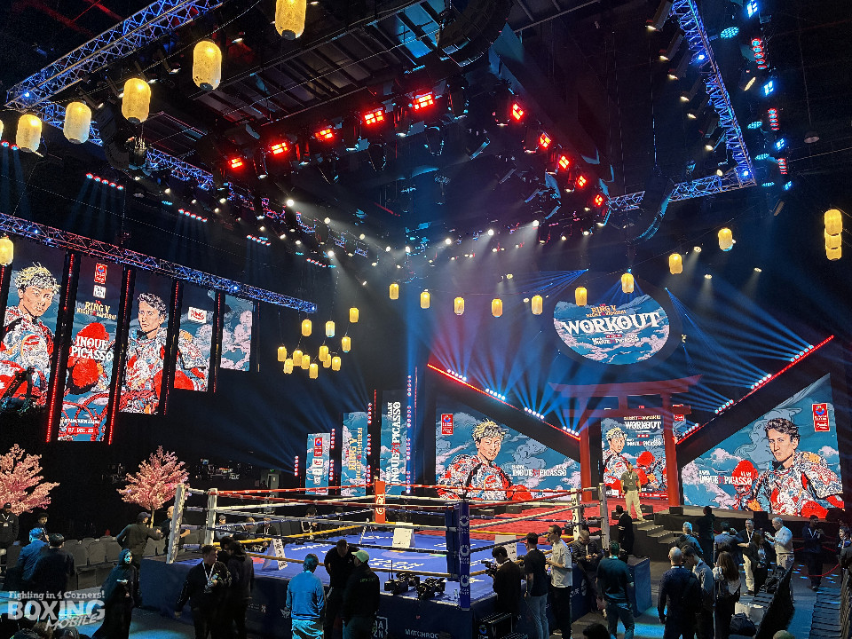 公開練習の舞台となったGlobal Theatre Boulevard City Riyadhは、「桜」や「和」を基調とした豪華な演出が施された特別な空間。その中で全体の4番目に登場した今永は、軽快なシャドーボクシングを披露した後、報道陣の写真撮影に応じ、落ち着いた表情を見せた。