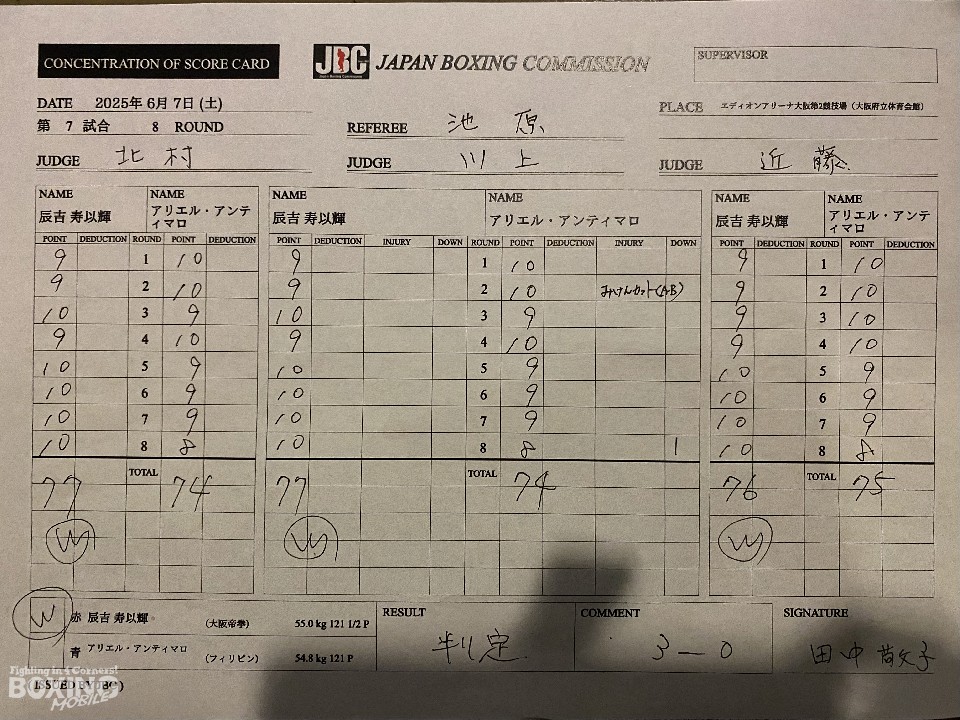 序盤は、アンティマロの左ストレート、変則的な左アッパーを浴びて、ペースを掴めなかった辰吉だが、5回以降はプレスをかけて、右フック、ワンツーを好打。積極的に攻めてポイントを連取すると、最終8回には左フックでダウンを奪い、判定勝ちした。中盤から相手のパンチを見切り、ブロックとボディワークで決定打を外した点も光った。