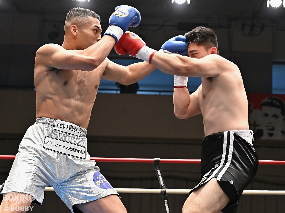 メインイベントでは、イケメン・ディーケイ(32=スパイダー根本)と中野ムーサ(19=DANGAN)が対戦した。中野が右ロングフックとジャブを駆使して、相手の動きに対応。1〜3回は決定打こそ出なかったが、見栄えの良さや防御で優勢をアピール。4回、イケメンは右オーバーハンドを決めたが、前半の貯金を守った中野が勝利した。