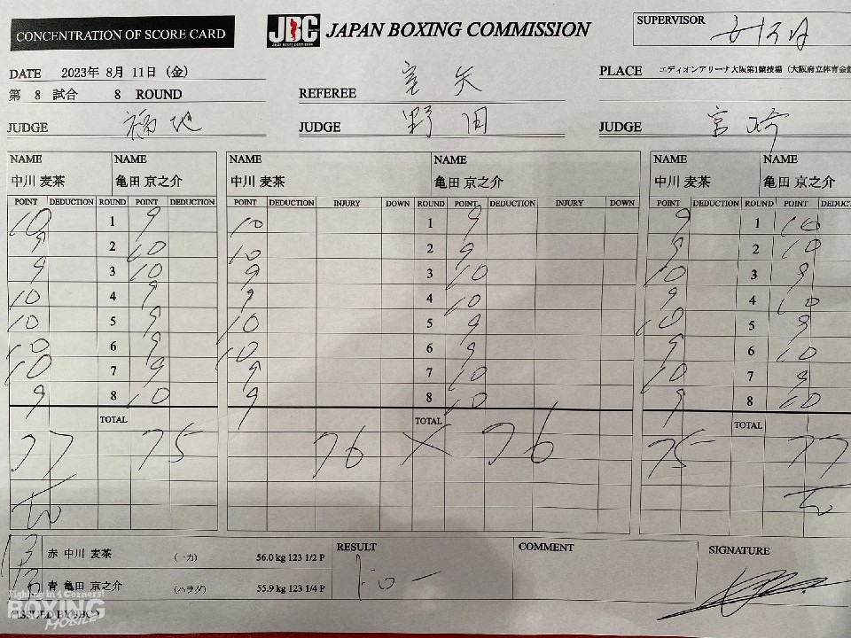 亀田京之介は、「まあ、判定では、1者相手につけてたけど、ドローとは思わなかった。ジャブは当てられてるけど、思ったより弱かった。パンチはあるかと思ったが、パンチは自分のほうがあった。右ストレートを見過ぎで、合わそうとし過ぎた。距離は遠かった。悔しいところはあります。再戦しようといって来てくれたが、結果は分かり切ってた。どうしてもというなら、やってもいい」と、心境を述べた。