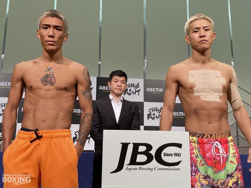 日本フェザー級5位の亀田京之介(25=TMK)と日本スーパーバンタム級6位の中川麦茶(35=ミツキ)が27日、びわ湖プリンスホテルで前日計量と記者会見に臨んだ。