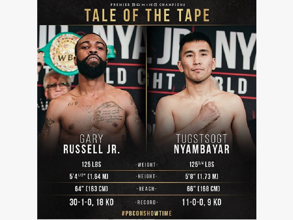 ペンシルベニア州のメインイベントとして開催されるWBC(世界ボクシング評議会)フェザー級タイトルマッチは、同級リミット57.1kgを王者ゲイリー・ラッセルJr(米)が400g少ない56.7kgでパス。挑戦者1位ツグスソグ・ニヤンバヤル(モンゴル)は100gアンダーの57kgで秤を下りた。