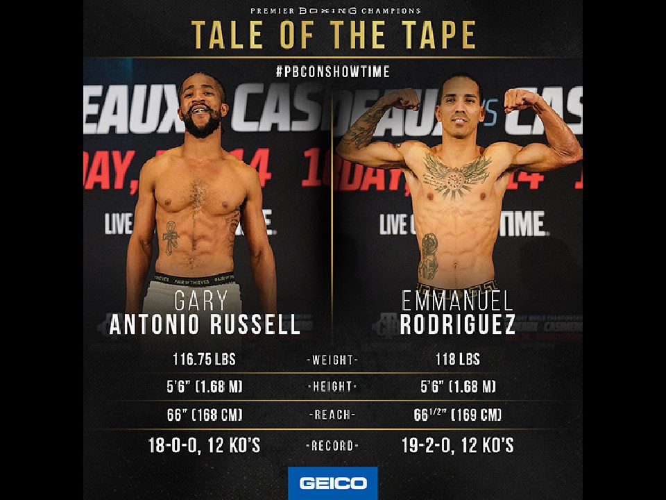米国コミッション協会(ABC)がWBAの度重なる世界王座乱立に改革要求を突きつける中、開催されるWBA世界バンタム級暫定王座決定戦。ラッセルは500g少ない52.9kgでパス、ロドリゲスがリミット53.5kgでクリアした。