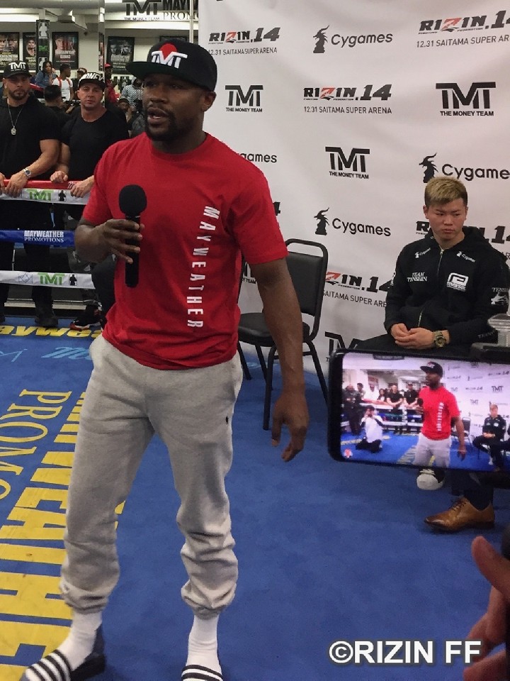 「初めてのラスベガスにワクワクしている。試合まで残り日はないが、いい結果が残せるように練習したい。自分は考える余裕もないので、本気で挑戦させていただきます」と意気込む那須川に対し、30分遅れて到着したメイウェザーは、「12ラウンド戦うのが試合だから、これは自分にとって特別なイベントではない。どちらの戦歴にも傷がつくことはない。でも大きなお金が動くし、ファンには9分間のエンターテインメントを見せたい」と、試合はあくまでもエキシビジョンであることを強調した。
