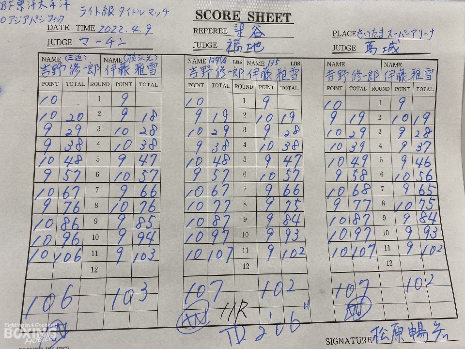 「注目度のある試合で、気合いが入った。この試合が決まって、伊藤選手のおかげで強くなった」と、大一番を終えて、世界のトップ戦線入りを目指す吉野は、ハイレベルな戦いの中で浮き彫りとなった課題も口にした。「倒したかった。効いてるのはわかった。まとめきれず大ぶりになったのは課題。コンパクトに打つ意識を持ちたい。ステップアップしていく、世界は会長に任せて自分は日々レベルアップしていく」。それでも、「初の後楽園ホール以外の試合は、めっちゃ楽しかった。人が多くて嬉しい。興奮した。記者会見が一番苦手なので練習します」と、目を輝かせた。