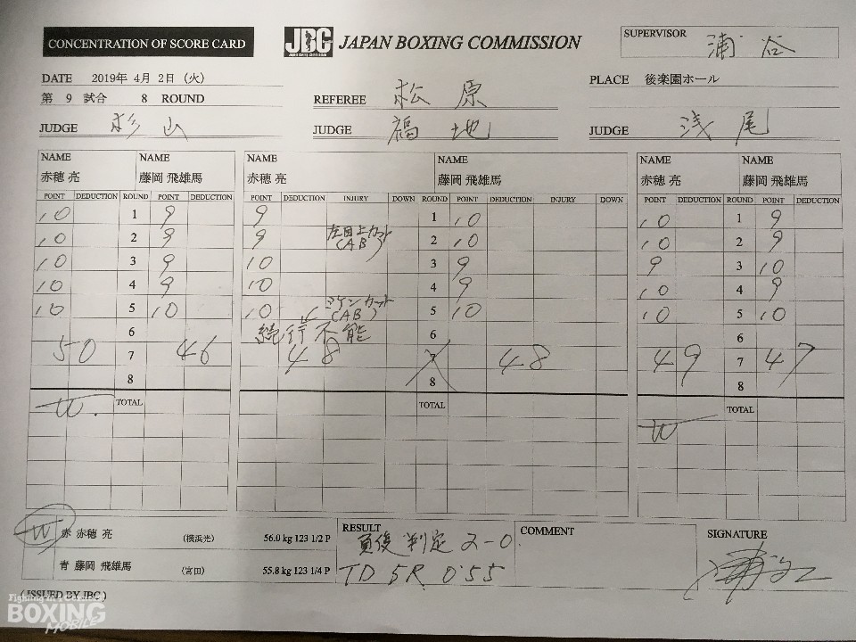 一方、世界ランカーと真っ向から打ち合った藤岡は、「パンチはこれまで戦ってきた相手の中で一番あったが、自分のやりたいことはできた。やりずらそうにしているのがわかった。採点以上の差はないと思う。自信になった」と手応えを感じていた。笑顔を見せた藤岡は、「こうして盛り上がったのは赤穂さんと両応援団のおかげ。また、こういう盛り上がる試合がしたい。赤穂さんが僕にかまってくれる時間があるなら再戦したい」と感謝の気持ちを言葉にした後にリターンマッチを希望した。