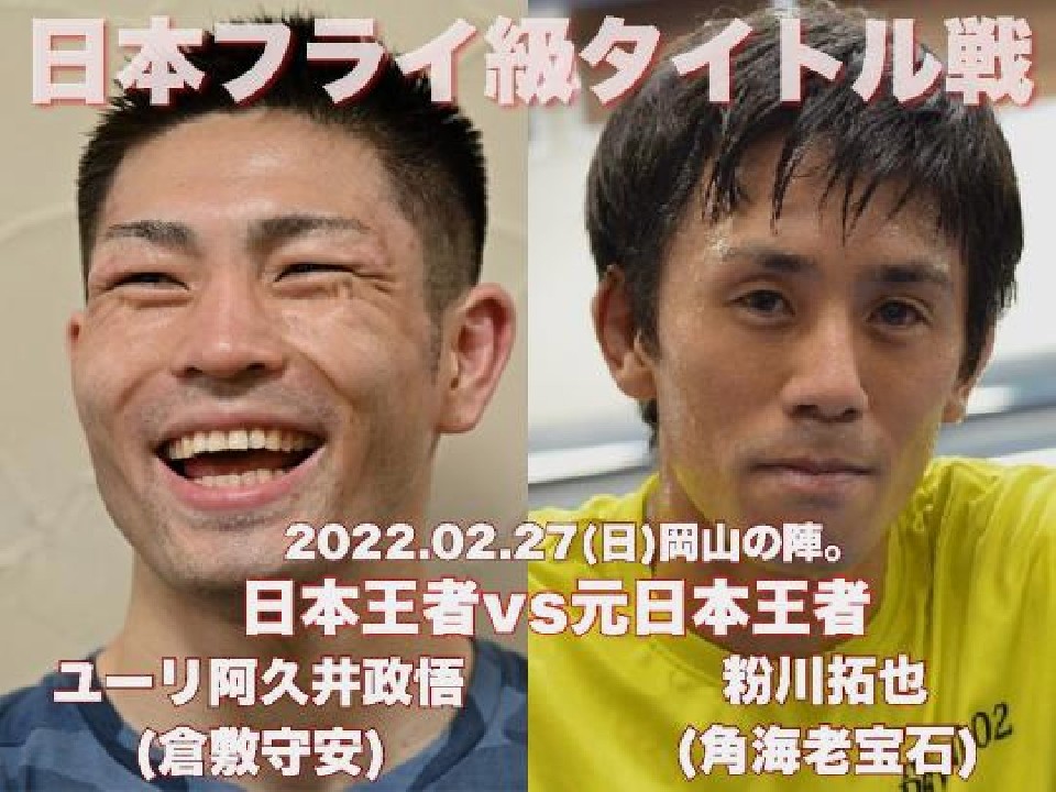 強打とテクニックを兼ね備えたフライ級絶対王者の阿久井が力を示すのか? それとも40戦目を迎える粉川が3度目の王座返り咲きを果たすのか? 明日、岡山のリングが熱い!