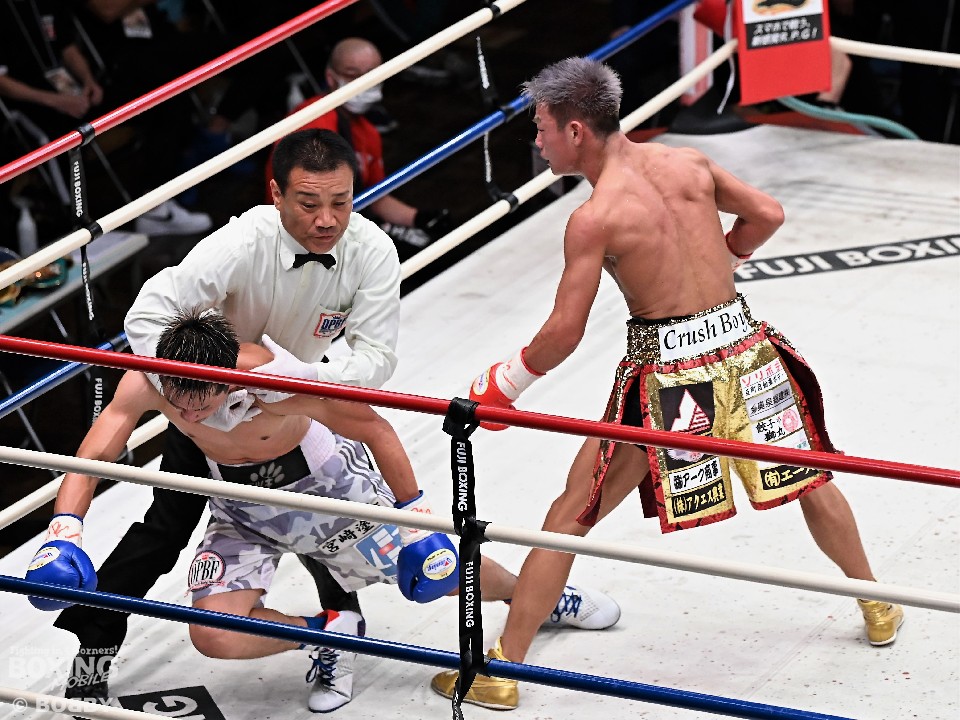 ステップワークに磨きをかけた勅使河原が、チャンピオンの実力を存分に発揮した。初回から勅使河原は細かくリズムを刻みながら、プレッシャーをかけてサウスポー河村を追い詰めた。2回になるとボディにもパンチを打ち込み主導権を掌握。ベルト奪取に闘志を燃やす河村は、左ストレートを繰り出すが、勅使河原は反応の良さを見せて回避した。4ラウンド終了時の公開採点をフルマークで折り返した勅使河原は、6回にワンツーから連打でダウンを奪うと、立ち上がった河村を仕留めた。