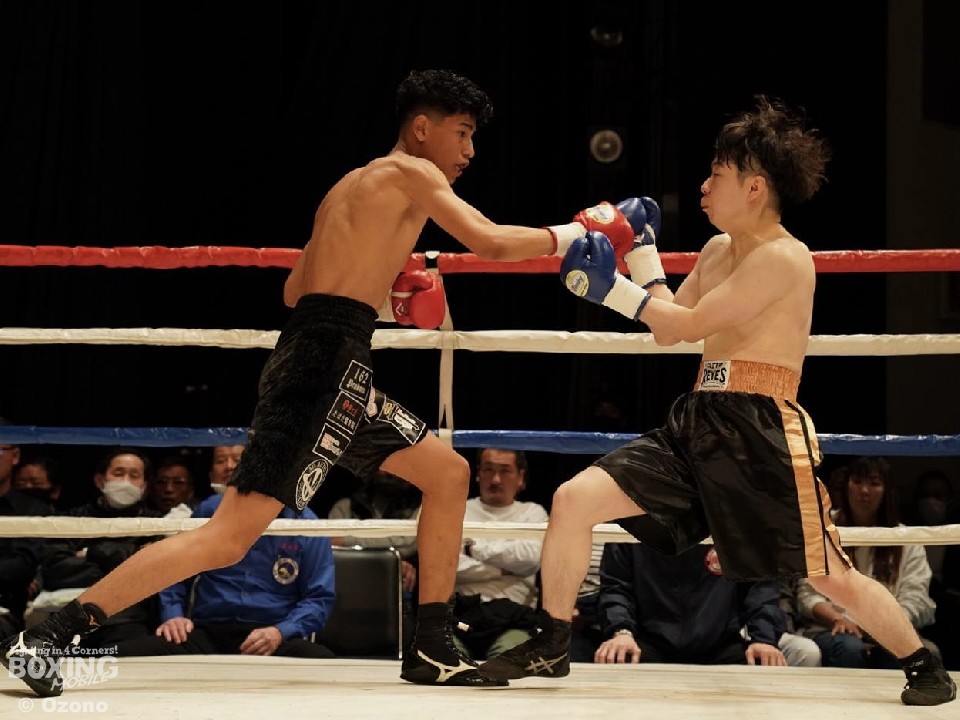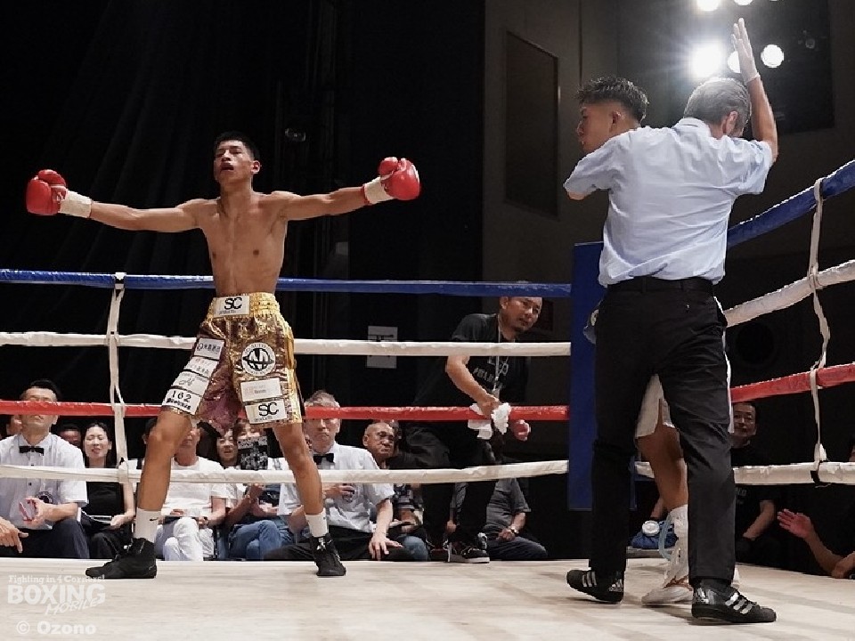 開始早々、エスピノサが左フックを強振すると、左右をまとめてダウンを演出。一気に仕留めに行くが、パンチの振りが大きくスタミナを消耗。サウスポー城本は、ワンツーで顔を弾くと連打で反撃。2回も城本はプッシュしながら、上下に打ち分け攻勢。ロープを背負ったエスピノサだが、右ストレートを叩きつけてチャンスを探った。3回、エスピノサは右カウンターから怒涛の連打で、レフェリーストップに持ち込んだ。