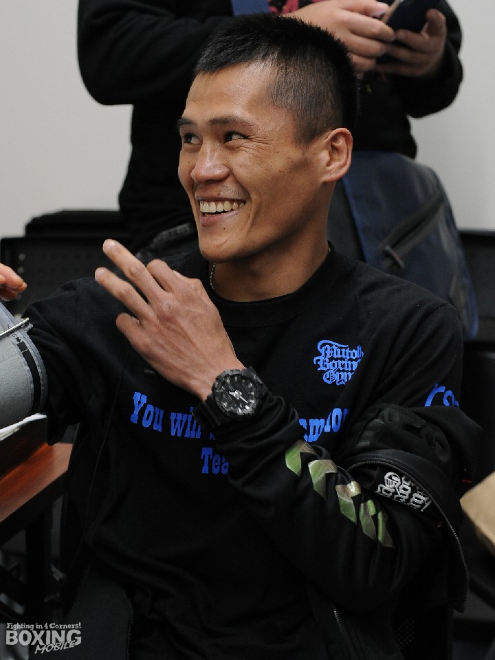 敵地で3度目の防衛戦に臨むフィリピン出身のヤップは、100gアンダーで秤を降りると疲れた様子もなく「コンディションは大丈夫。世界チャンピオンになりたいから負けられない」と笑顔を交え日本語でコメント。指導して3年が経つ枝川孝会長も、4連続KO中と抜群の安定感を誇る王者へと成長したヤップに「どうにかして世界まで行かせたい。フィリピンのALAジムに捨てられた選手がここまで育ったのだから、母国の憧れの選手になってほしい」と期待し、「明日はKOで勝つんやろ」と注文づけた。