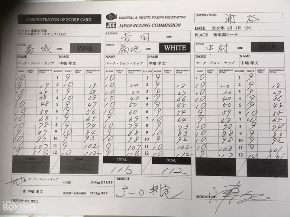 初回、ヤップは右ストレートでペースを握ると、ジャブで組み立て鋭いパンチで襲いかかった。中嶋は2回に相手のパンチで左目上をカット。4回、ヤップはプレスをかけて左ボディで体力を削るとワンツーで攻勢を印象づけた。ラウンド終盤に中嶋は右アッパーで反撃したが、4回終了時の公開採点は1者が38-38、2者が40-36でヤップがリードした。5回、劣勢の中嶋は右クロス、右アッパーでのけぞらせるが、ヤップも負けじと打ち返す。中盤はヤップのジャブが機能してポイントを加点すると、8回終了時にはさらに差を広げた。その後もヤップは軽快なフットワークでペースを維持。最終12回、大声援を背にコーナーを飛び出した中嶋は逆転を狙ったが、ヤップの老獪なボクシングに決定打を作り出せず、最大6ポイント差をつけたヤップが3度目の防衛に成功した。