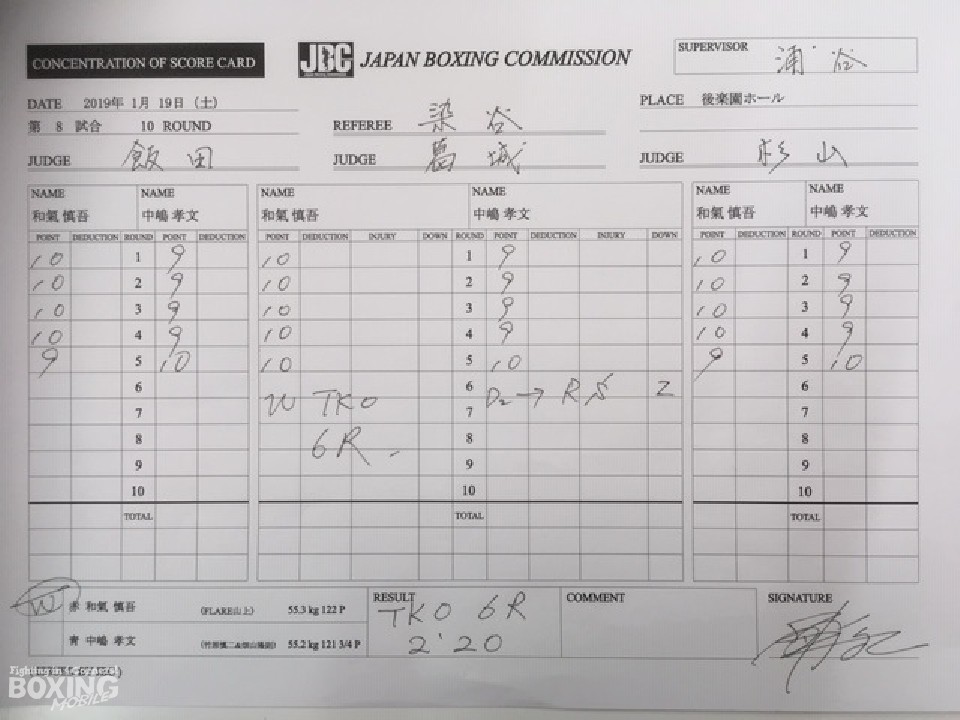 初回は中嶋が相手の左を外し右ストレートで仕掛けたが、2回になると和氣が左アッパーをヒットし後退させた。和氣はボディワークとステップバックで捌きペースを握るが決定機を作れず。しかし、6回にカウンターの左アッパーを決めて痛烈なダウンを演出。なんとか立ち上がった中嶋だったが、連打から左ストレートを浴びでキャンバスに沈んだ。