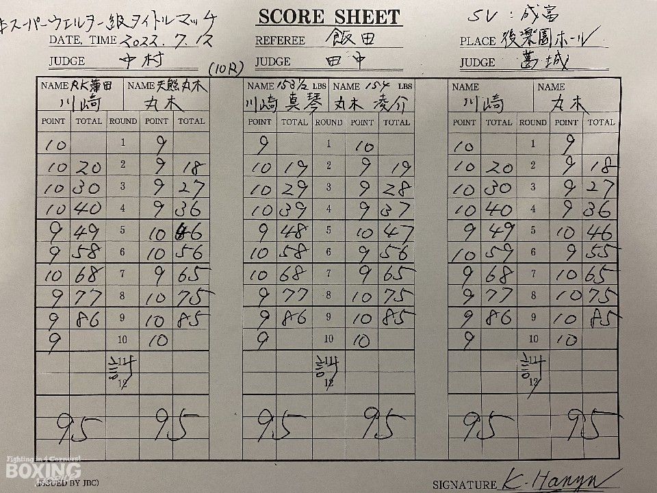 川崎が苦しみながらも、なんとかベルトを守り抜いた。前半は、川崎がジャブから丁寧に組み立てて、右クロスをヒット。丸木は左ボディを返すが、川崎の見栄えが上回った。前半終了時の公開採点は、48-47×1、49-46×2で川崎がリード。ポイントで劣勢の丸木は、7回から距離を潰して右フック、左ボディで反撃。手数が減った川崎を攻め立てた。最終10回も、丸木が打ち勝った。ジャッジ3者ともに95-95とし、決着が着かなかった。