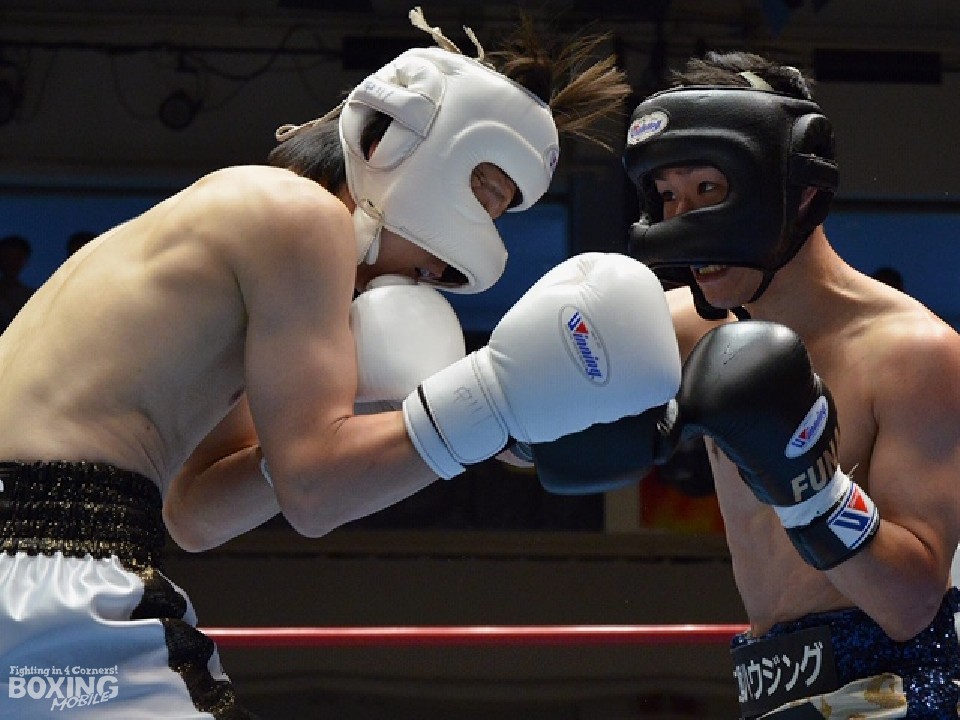 サウスポー中川がサイドに回りながら左ストレートを繰り出すと船井も右ストレートで対抗。2回になると、激しいパンチの応酬で会場を沸かせた。