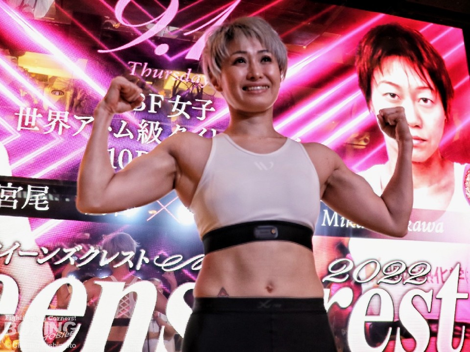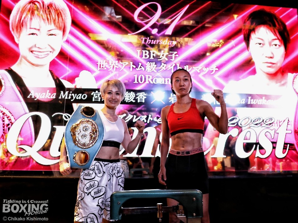 IBF(国際ボクシング連盟)アトム級王者の宮尾綾香(39=ワタナベ)と、挑戦者で前WBO(世界ボクシング機構)同級王者の岩川美花(39=姫路木下)が31日、都内の「CLUB CAMELOT-渋谷クラブキャメロット」で、記者会見と前日計量に臨んだ。両者ともに、アトム級リミットちょうどの46.2kgでパスした。