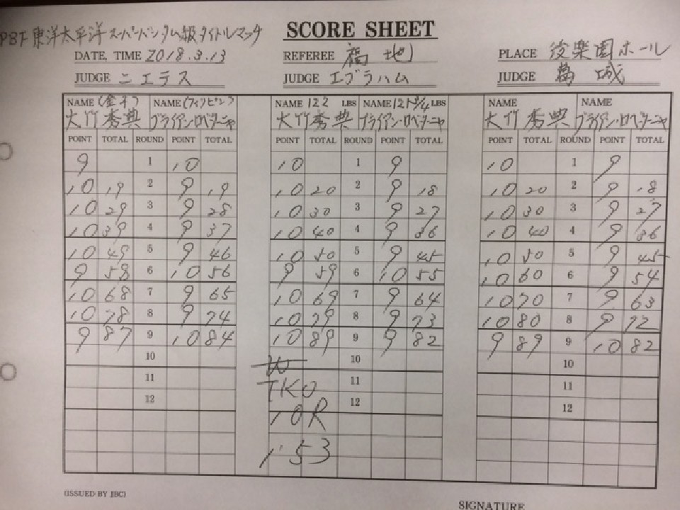 試合は予想通りにロベターニャが右のオーバーハンドで襲いかかり、これを大竹が下がらずに右クロス、左ボディで応戦した。両者ともエンジン全開の立ち上がりとなったが、大竹の圧力と手数が上回り、4回までの途中採点で大差のリード。しかし、タフな挑戦者を崩しきれず、主導権は握り続けたものの後半はペースを落としてしまった。次第に挑戦者の粘りが目立ち、追い上げを許したが、8回の途中採点もリードを維持した大竹は、いよいよ足に力が入らなくなり手打ちとなった挑戦者を攻め立て、10回に右ストレートでダウンを奪う。ここは立ち上がったロベターニャだが、追撃を振り切れずにレフェリーストップ。大竹が3度目の防衛をはたすと同時に、世界を大きくアピールした。