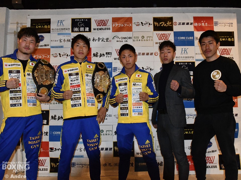 元東洋太平洋ミニマム級暫定王者で日本ライトフライ級2位の加納陸(大成)と日本ユース・フェザー級王者の松岡輝(大成)、日本ユース・フライ級王者の松岡新(大成)が4日、三田市内のジムで次戦の発表会見に臨んだ。試合は、5月5日(日)に三田市内のセレクトンプレミア神戸三田ホテルで開催される「三田から世界へ 14」で3大タイトルマッチとして行われる。昨年12月、双子で同時に日本ユースのベルトを巻いた松岡兄弟は「しっかり勝つ」と意気込んだ。また、この日は日本ユースタイトルにアタックする挑戦者も顔を揃えての会見となった。