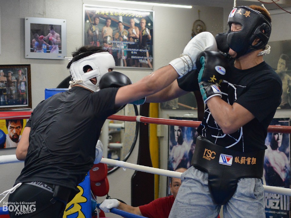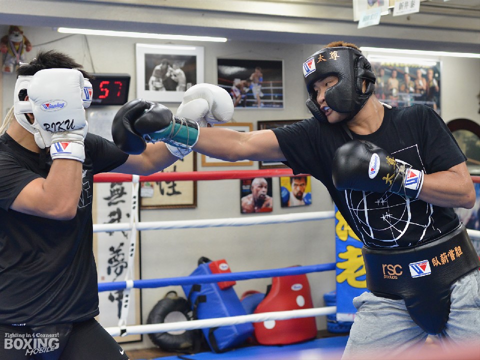 サウスポーの太尊とは6ラウンドのスパーリングで重厚なぶつかり合いを見せた。序盤、国本は距離を取ってリズムを計ると、踏み込んで右を突く。190cmと長身の太尊の懐は深く、左ストレートを狙われてしまうが、ならばと距離を潰し、パワー勝負に持ち込んだ国本が何度か太尊をロープに詰め右フックを好打した。太尊も上手く引き寄せては左アッパーをねじ込み、キャリアの差を見せつけたが、国本のパワーに後退を余儀なくされた。