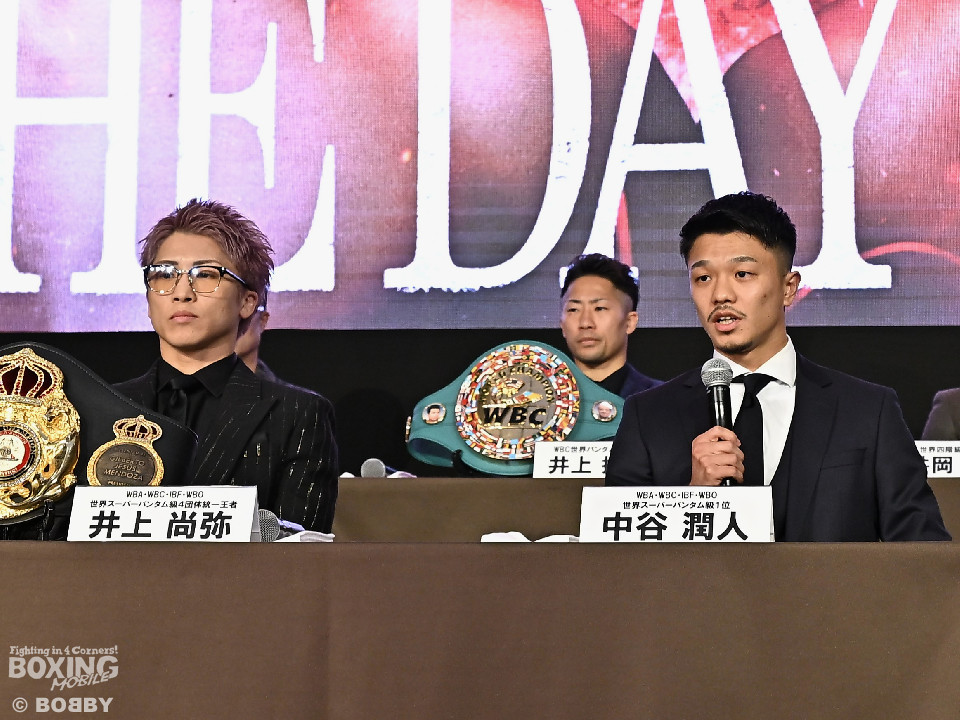 中谷は「もうスイッチは入っている。井上選手のことは、バンタム級に上げてから意識し始めた。いろいろな展開を想定して準備している」と話した。