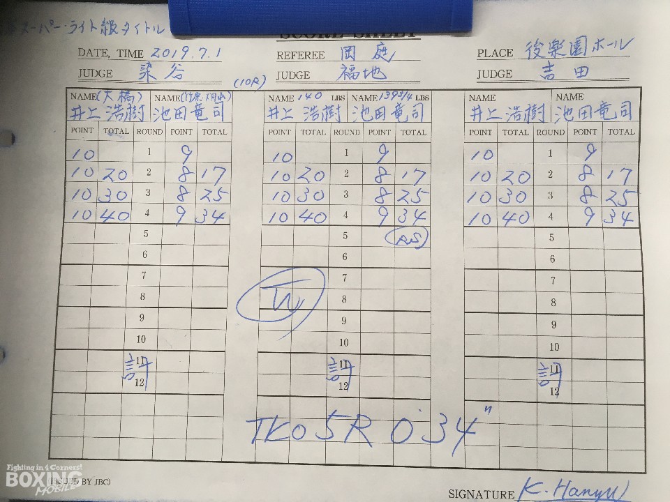 サウスポー井上が丁寧にジャブを突きながら左ストレートをボディ、顔面に決めて上々のスタートを切る。動きが固い池田だったが、2回にワンツーを返し反撃。しかし、井上は冷静に対処するとラウンド終盤に左ストレートでロープダウンを奪った。3回にも左で引き寄せて右フックで2度目のダウンを演出。池田は偶然のバッティングで眉間をカットした。すると5回開始早々、井上は左ストレートを効かせるとコーナーに詰めてフィニッシュに持ち込んだ。