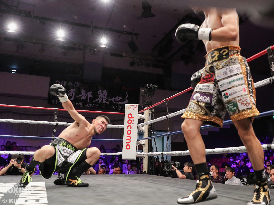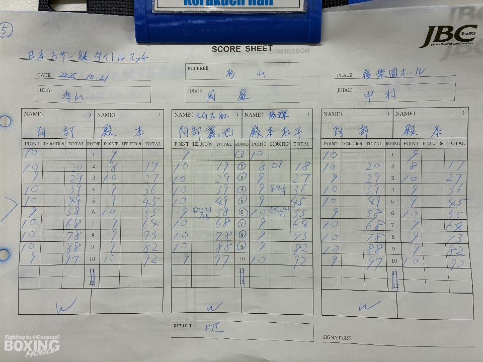 試合が動いたのは2回。サウスポーの阿部が左カウンターを的確に合わせ、殿本からダウンを奪取。立ち上がった殿本はダメージを感じさせず、トリッキーな動きで反撃した。4〜5回は、前へ出る殿本に対し、阿部がカウンターで迎え撃つ構図が続いた。前半終了時の公開採点は、49-45×3で阿部がリード。6回には殿本の左フックが阿部をとらえたが、7回以降は阿部がフットワークを駆使しながら、要所で左ストレートをヒット。最終10回、殿本の猛追をクリンチでいなし、冷静に逃げ切った。