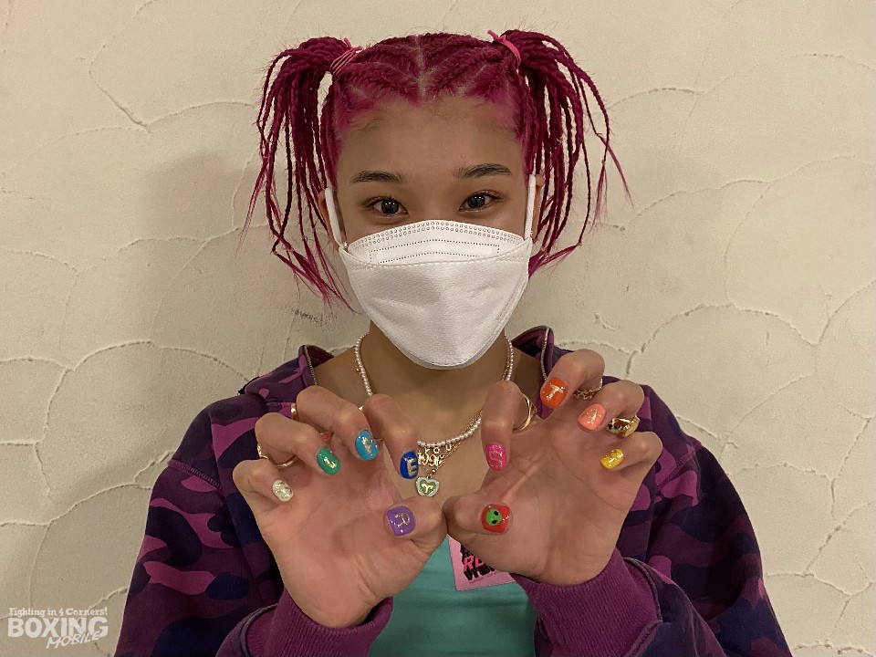 デビューからわずか2戦目で現役王者と拳を交える晝田は、スーパーフライ級リミットを200g下回る51.9sで秤を降りた。一昨日にネイルサロンで爪に「SUPER STAR(スーパースター)」と描いてもらい、今朝、美容室で髪の毛をピンク色にカラーリングし、戦闘態勢に入った。
